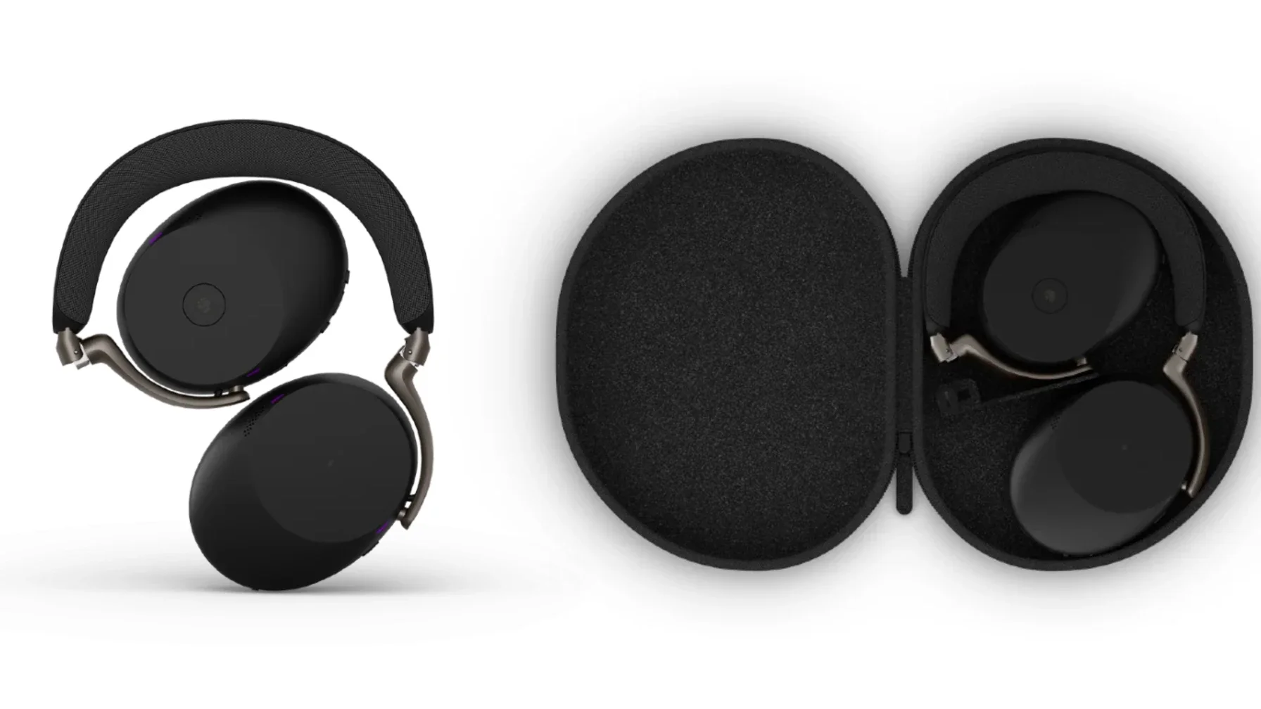 Both models ship with the headset, a Link 390 Bluetooth adapter (USB-A or USB-C depending on SKU), a compact travel case, a USB-C charging cable, and a 3.5mm audio cable for wired use. Select SKU bundles also include the Jabra Evolve Wireless Charging Pad. Replacement ear cushions and battery packs are available as standalone accessories for long-term maintenance.