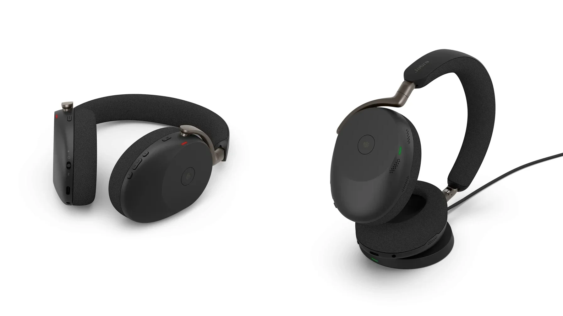 But the headline feature is the rapid charge capability. Plugging in for just ten minutes via USB-C gives you ten hours of use. Need to jump on a call in five minutes? Five minutes on the charger delivers five hours of talk time. Both models also support Qi wireless charging — drop the headset on a charging pad at your desk, and it tops up passively throughout the day. For organizations deploying these at scale, Jabra offers a dedicated Evolve Wireless Charging Pad as a bundle or standalone accessory.